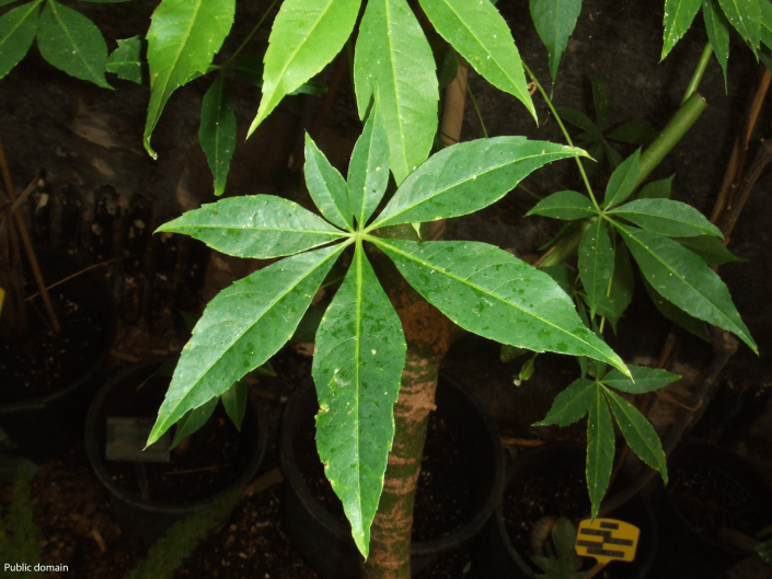 The leaf structure is like the five fingers of a palm. So this particular shape when we are actually talking about leaves is called digitate because of course these are our digits and the leaves are also shaped like the fingers on a hand and that’s what you also see on this leaf and the leaflet or the centre one that you usually see is the first, furthest away from the leaf stock and also tends to be the longest. Again, all of them are usually with pointy tips.